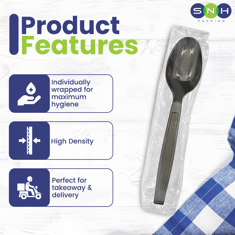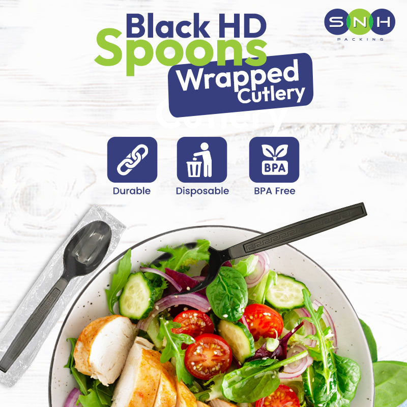 Black HD Wrap Spoons are designed for strength, durability, and professional food service use. Made from high-quality food-grade plastic, these heavy-duty disposable spoons are break-resistant and suitable for both hot and cold foods.