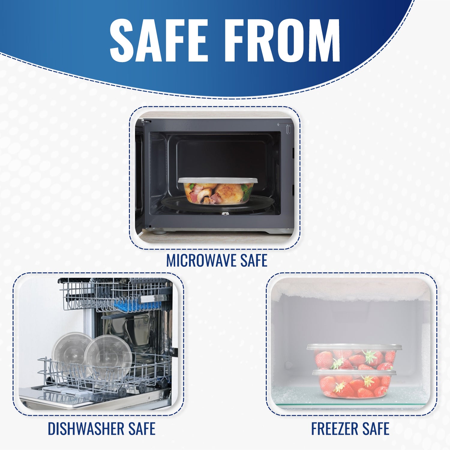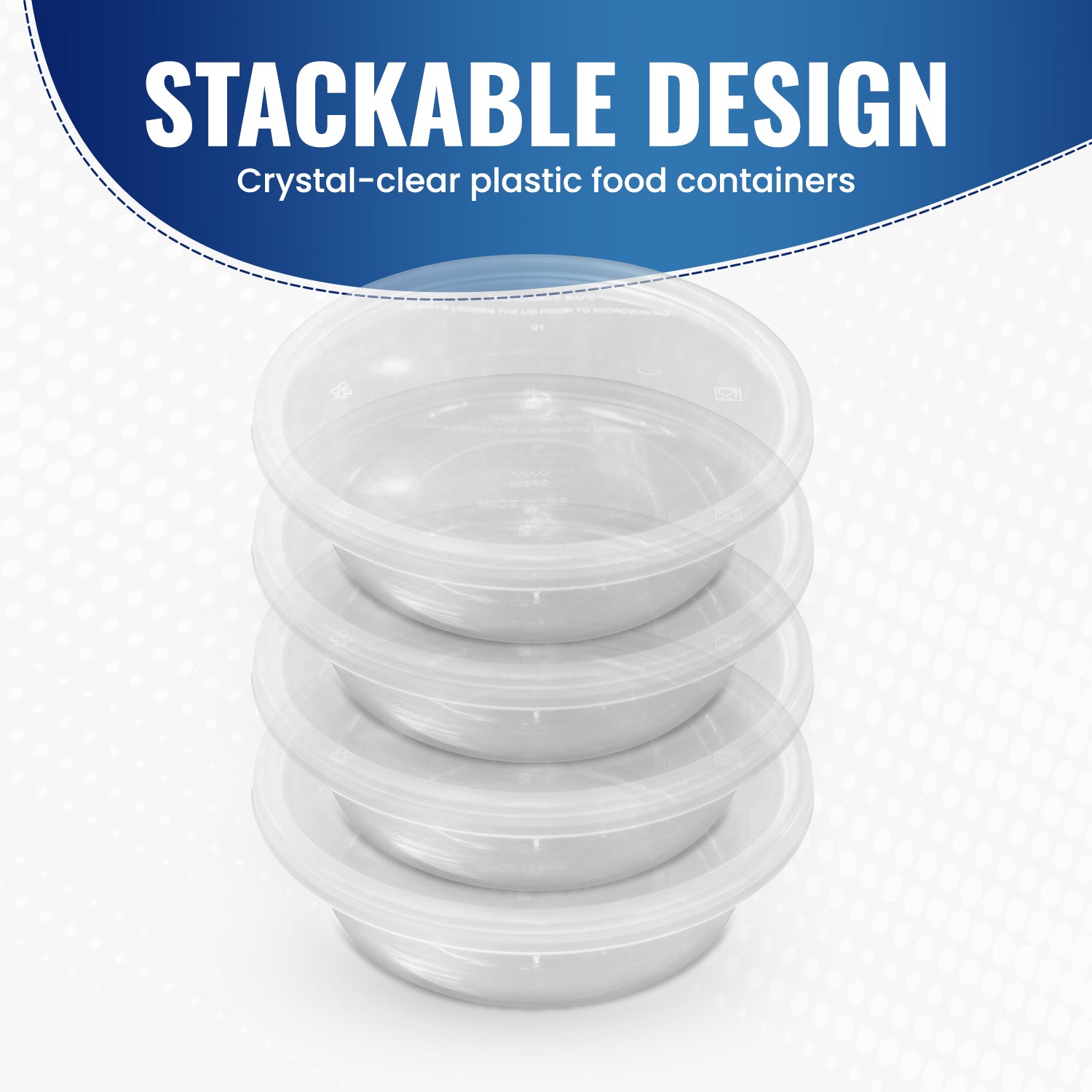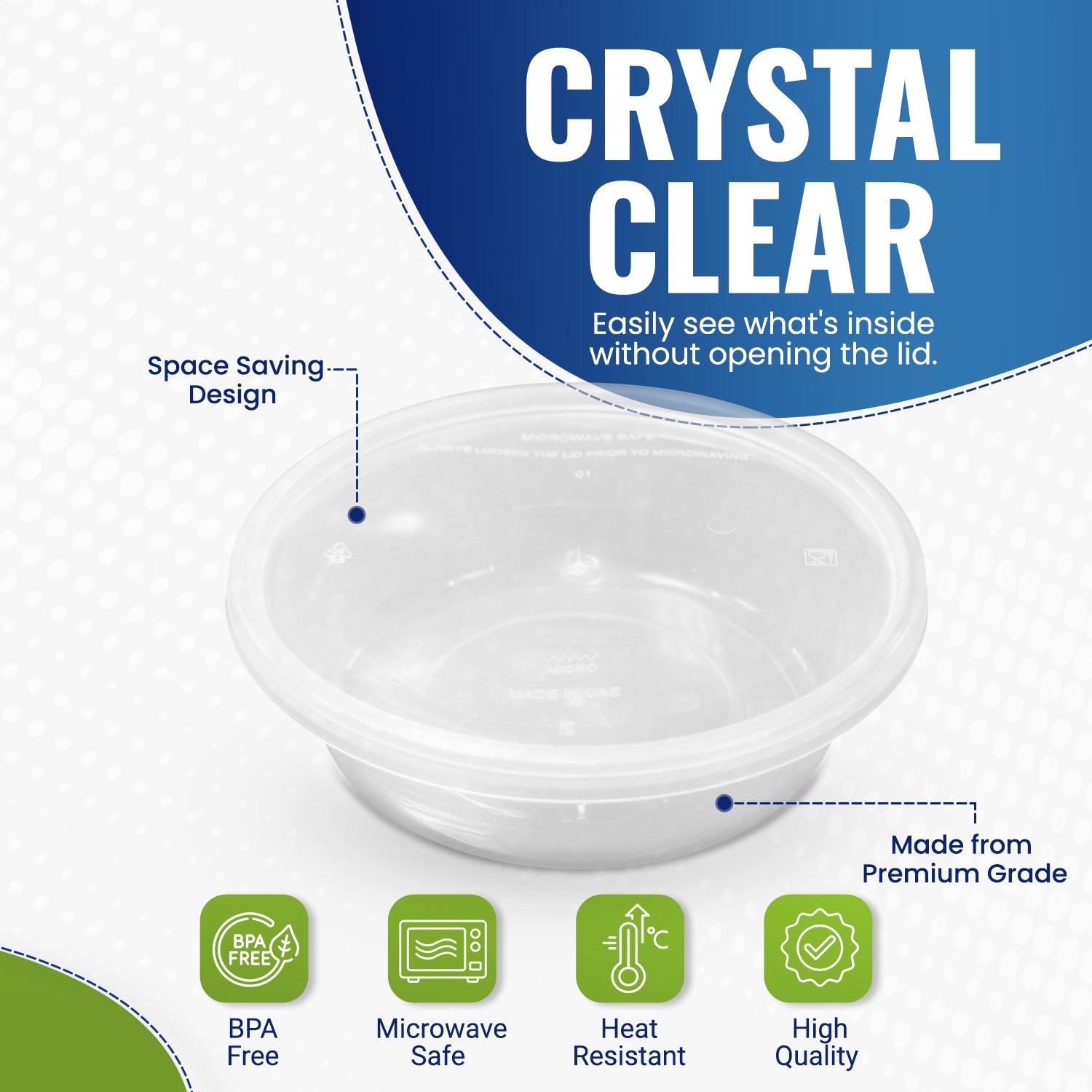 Clear Round Microwave Container is perfect for deli cases. The products can be heated in a microwave or frozen. Along with HD, these containers are temperature-tolerant and feature easy-to-open snap lids that keep food fresh in transit, you can also package pasta salad, condiments, and fruits in them, in addition to trail mix, bulk nuts, and dry ingredients. The containers are useful for freezing, microwave cooking, storing, transporting, displaying, and serving a wide variety of foods.