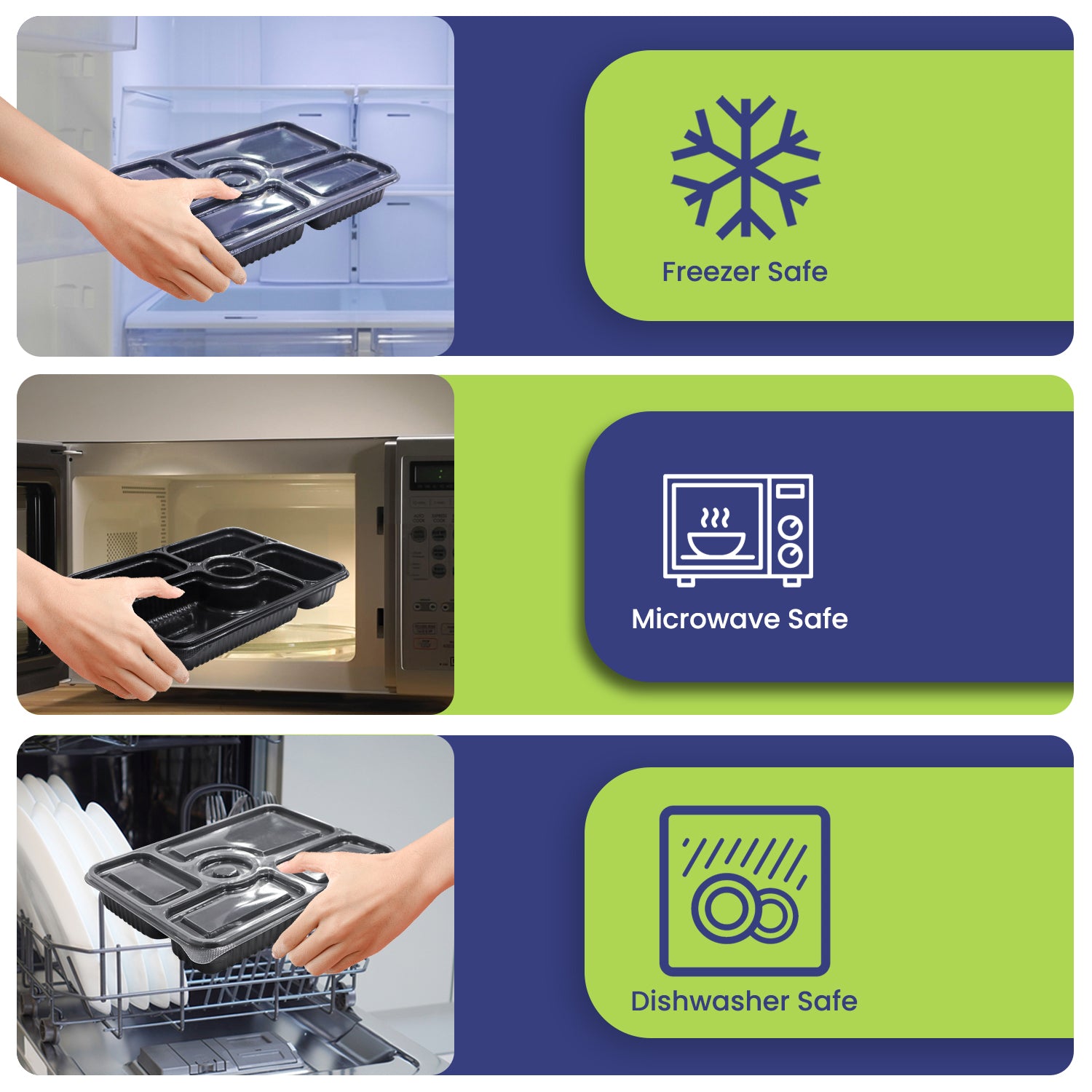 حاوية ميكروويف مكونة من 5 أقسام الحاوية والغطاء قابلان لإعادة التدوير وسهلا التنظيف، لذا بمجرد أن يأكل ضيوفك، يمكن إعادة استخدامهما أو التخلص منهما. تسمح المقصورات المنفصلة في الحاوية بتقديم المقبلات والوجبات الجانبية بشكل منفصل. وهي آمنة للاستخدام في الميكروويف، لذا يمكن للضيوف إعادة تسخين الطعام بسرعة في نفس وعاء الطهي الذي استخدموه لتقديمه.
