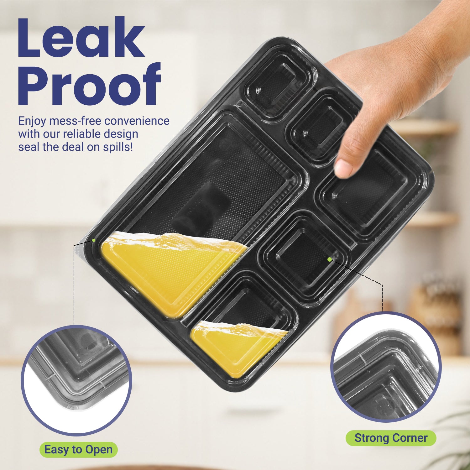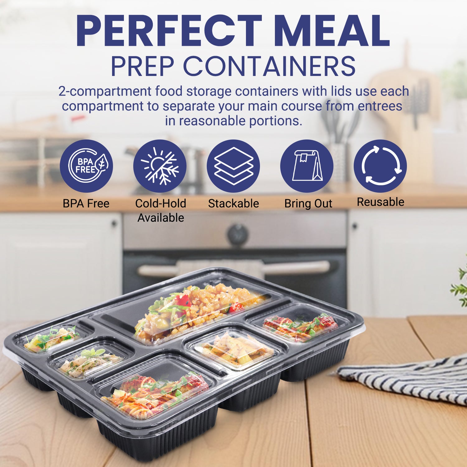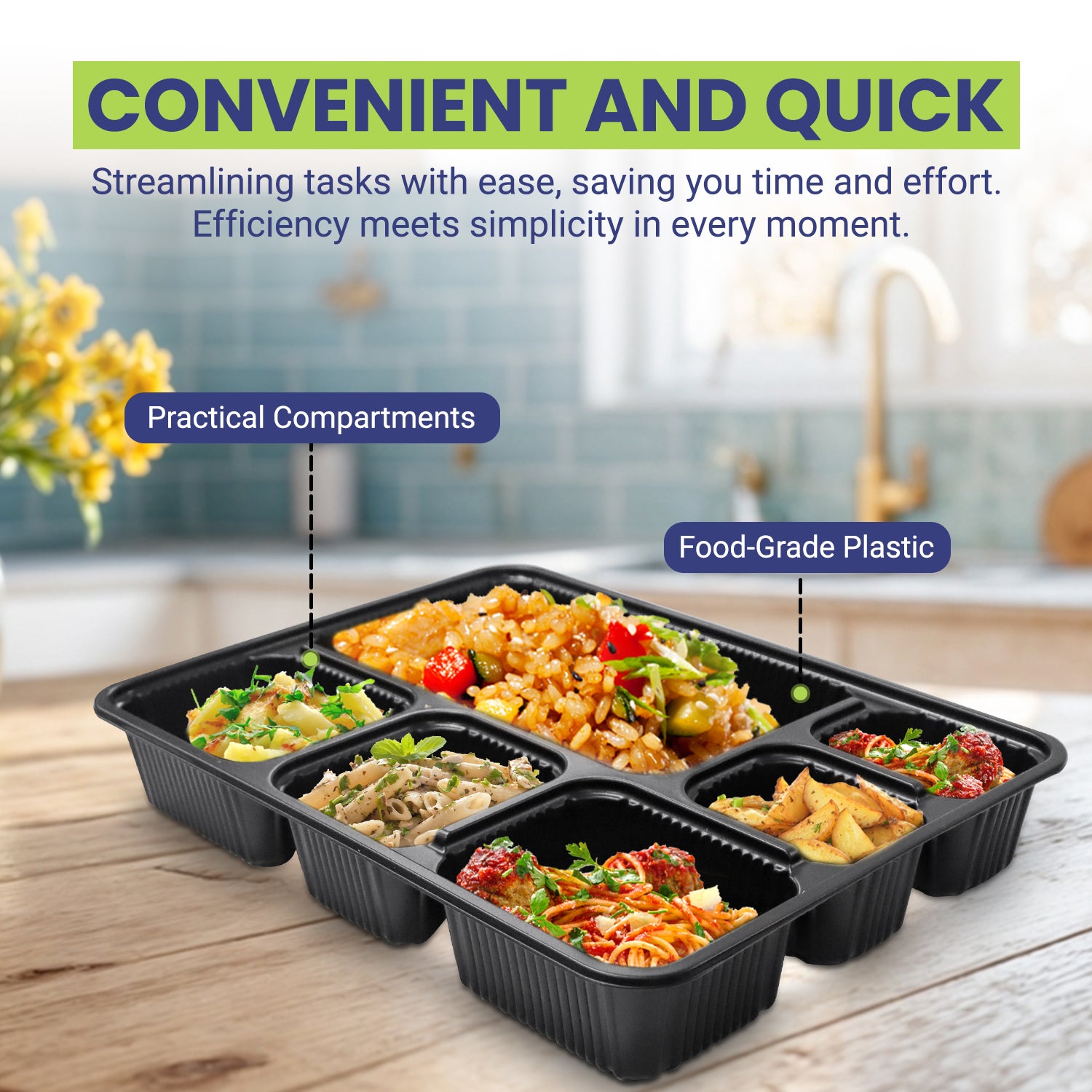حاوية ميكروويف مكونة من 6 أقسام الحاوية والغطاء قابلان لإعادة التدوير وسهلا التنظيف، لذا بمجرد أن يأكل ضيوفك، يمكن إعادة استخدامهما أو التخلص منهما. تسمح المقصورات المنفصلة في الحاوية بتقديم المقبلات والوجبات الجانبية بشكل منفصل. وهي آمنة للاستخدام في الميكروويف، حتى يتمكن الضيوف من إعادة تسخين الطعام بسرعة في نفس وعاء الطهي الذي استخدموه لتقديمه.