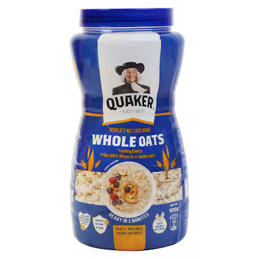 Quaker Whole Oats are made from 100% natural, premium-quality whole grain oats, offering a nutritious and wholesome start to your day. Packed in a durable 900g PET jar, these oats preserve freshness and are convenient for daily use. Rich in fiber, vitamins, and minerals, Quaker Oats help support heart health, sustained energy, and overall well-being. Ideal for making oatmeal, porridge, smoothies, baking, and healthy breakfast bowls. Perfect for homes, cafes, restaurants, and health-conscious consumers.
