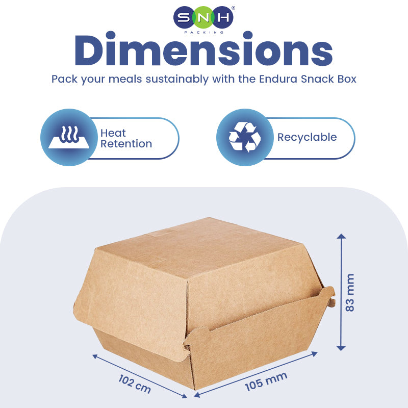 Keep your burgers fresh and secure with the Endura Burger Box Brown (105x102x83mm) — the perfect eco-friendly packaging for quick-service restaurants and cafés. Made from sturdy, biodegradable kraft paperboard, this box offers excellent insulation, durability, and a clean natural look. Its secure locking design ensures food stays warm and leak-free during delivery or takeaway. Ideal for burgers, sandwiches, snacks, and sides, these boxes combine practicality with sustainability, helping your business reduce plastic waste while maintaining a professional presentation.