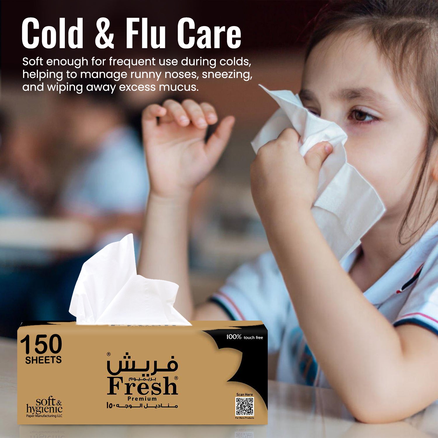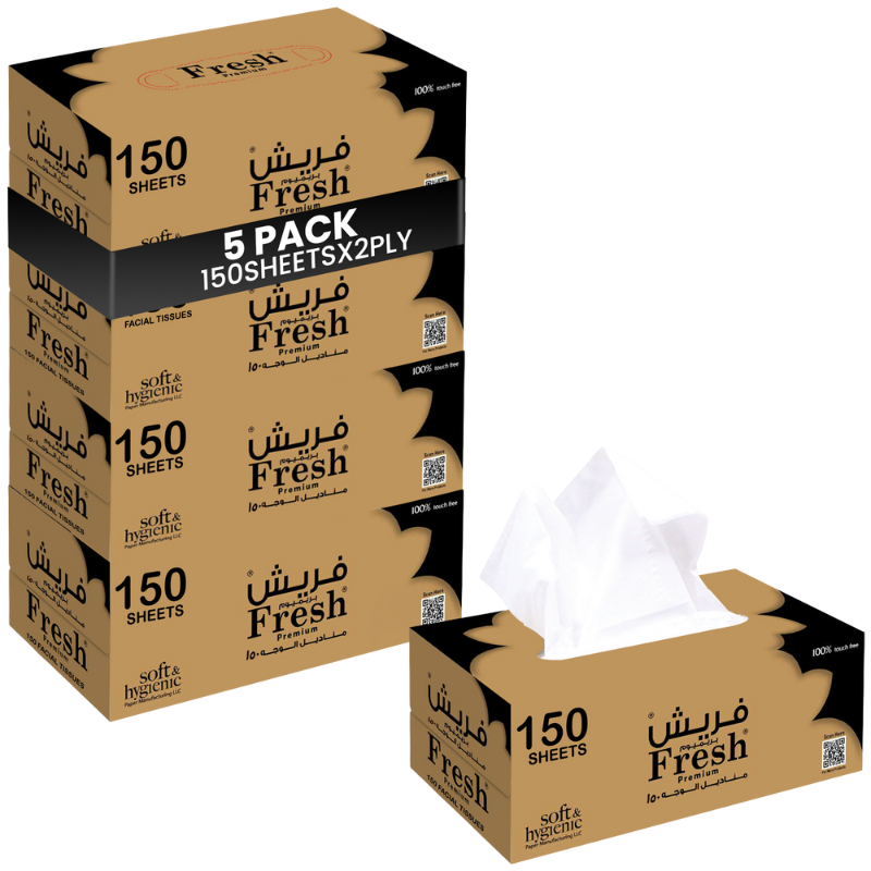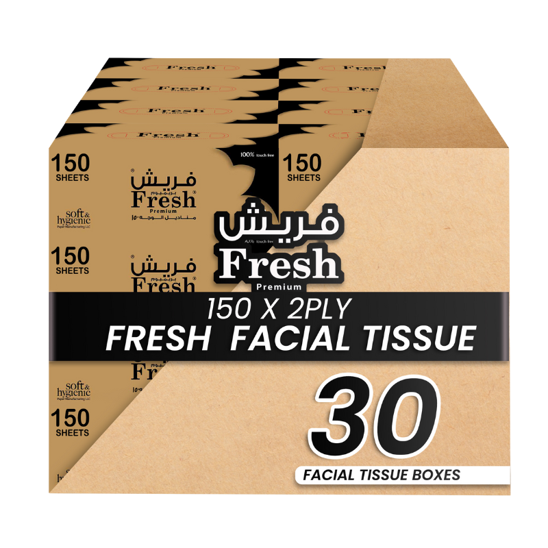 resh Facial Tissue 150 Sheets is designed for everyday hygiene and comfort. Made from soft and absorbent paper, these tissues are gentle on the skin while providing reliable strength for daily use. Ideal for homes, offices, hotels, restaurants, and commercial environments. Available in 5 boxes, 10 boxes, and 30 boxes packs, offering flexibility for both small and bulk requirements.
