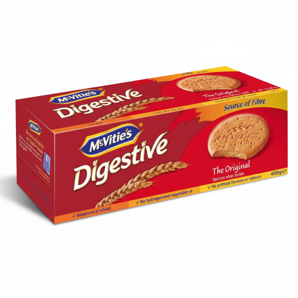 Enjoy the timeless taste of McVities Digestive Original Biscuits, made with wholesome wheat and baked to golden perfection. These lightly sweet, crunchy biscuits are perfect for tea-time snacking, dessert bases, or simply enjoying on their own. Loved worldwide for their comforting flavor and satisfying texture, theyre a must-have in every pantry.