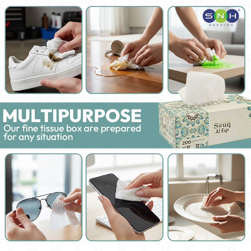 Souq Al Fajr Facial Tissue 200 Sheets is crafted for superior softness, strength, and hygiene. Designed to be gentle on the skin while offering excellent absorbency, these tissues are ideal for everyday personal care. Suitable for homes, offices, clinics, restaurants, and hospitality use. Available in 1 packet, 3 packet, and 6 packet options to meet both individual and bulk requirements.